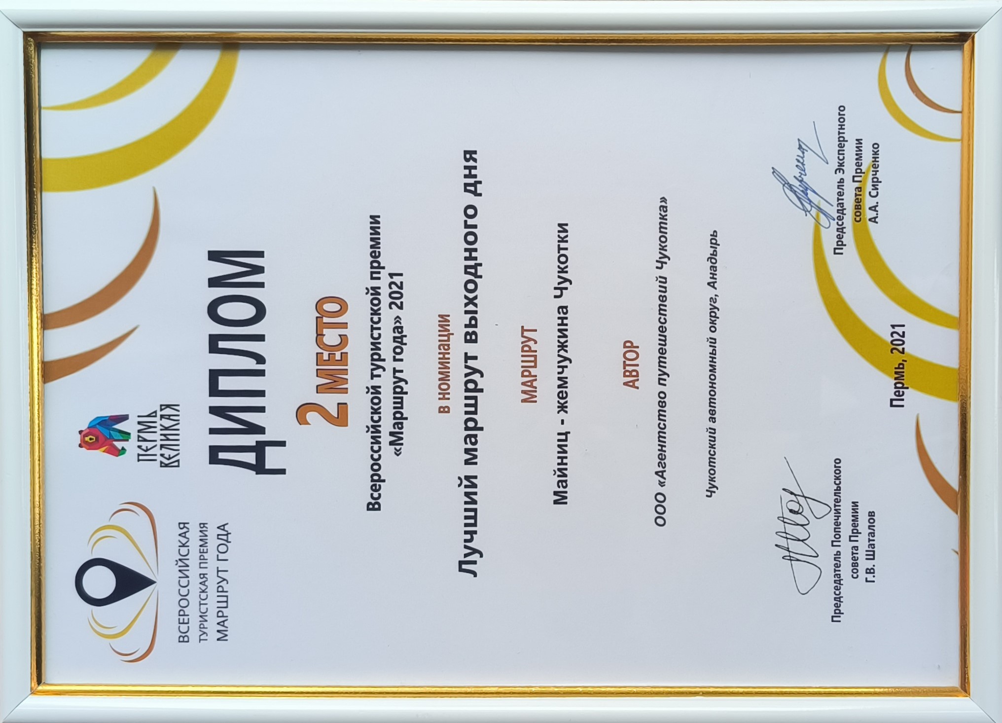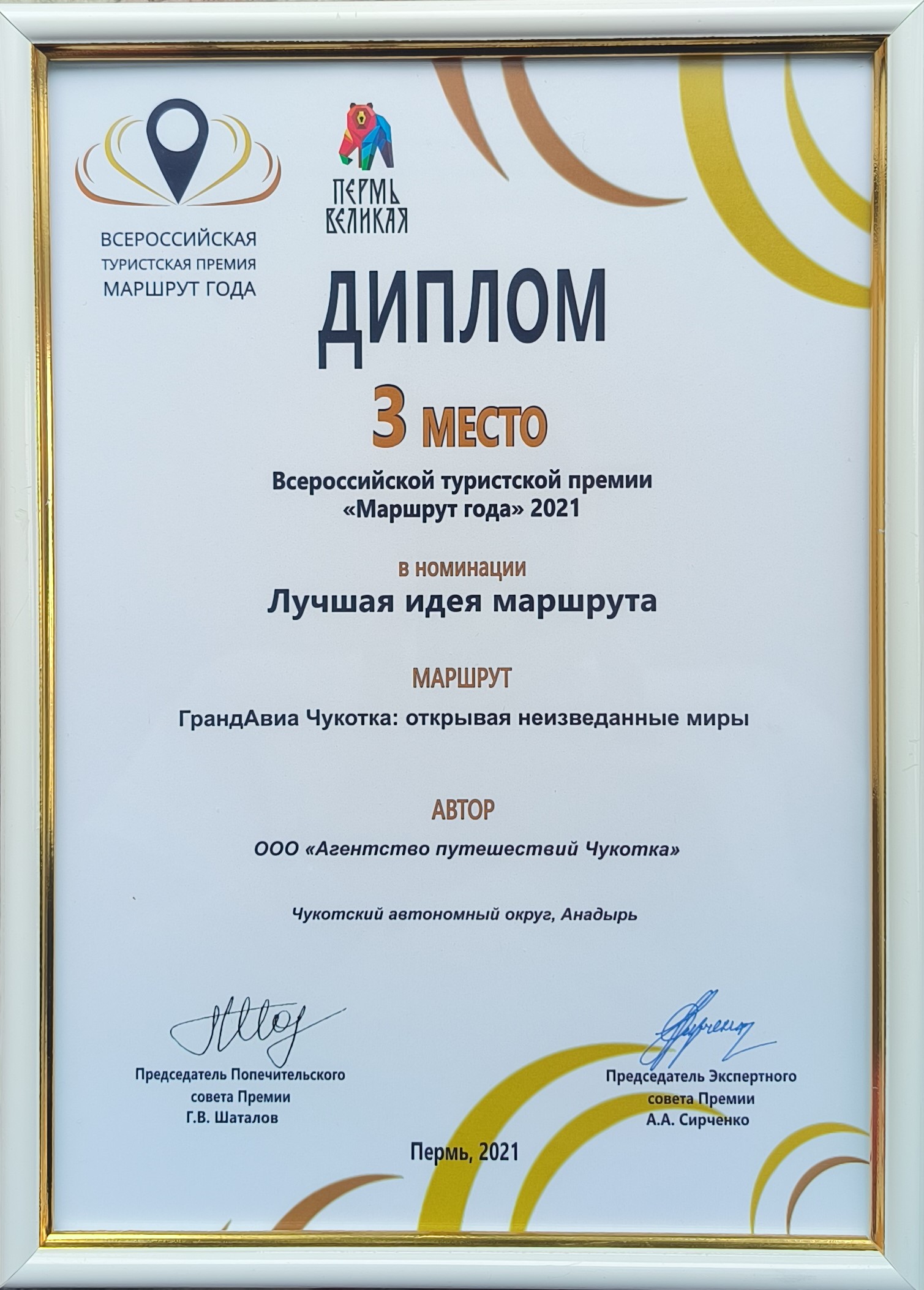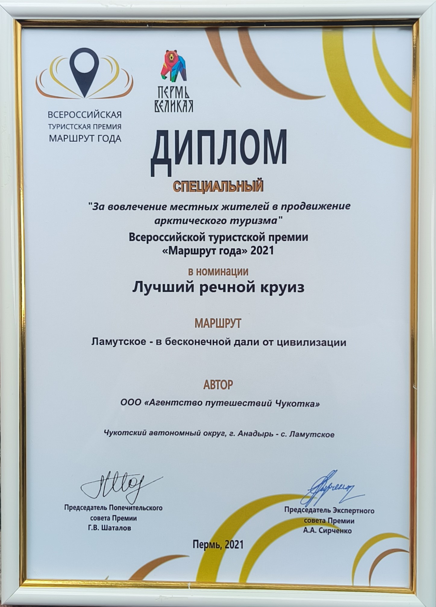 В 2021 году Туроператор «Агентство путешествий Чукотка» представил три авторских тура на Всероссийскую туристскую премию «Маршрут Года». Все наши маршруты прошли отбор в финал конкурса, где были отмечены наградами: двумя призовыми местами и специальной грамотой. Официальную информацию об итогах VIII Всероссийской туристской премии «Маршрут года» можно посмотреть здесь.