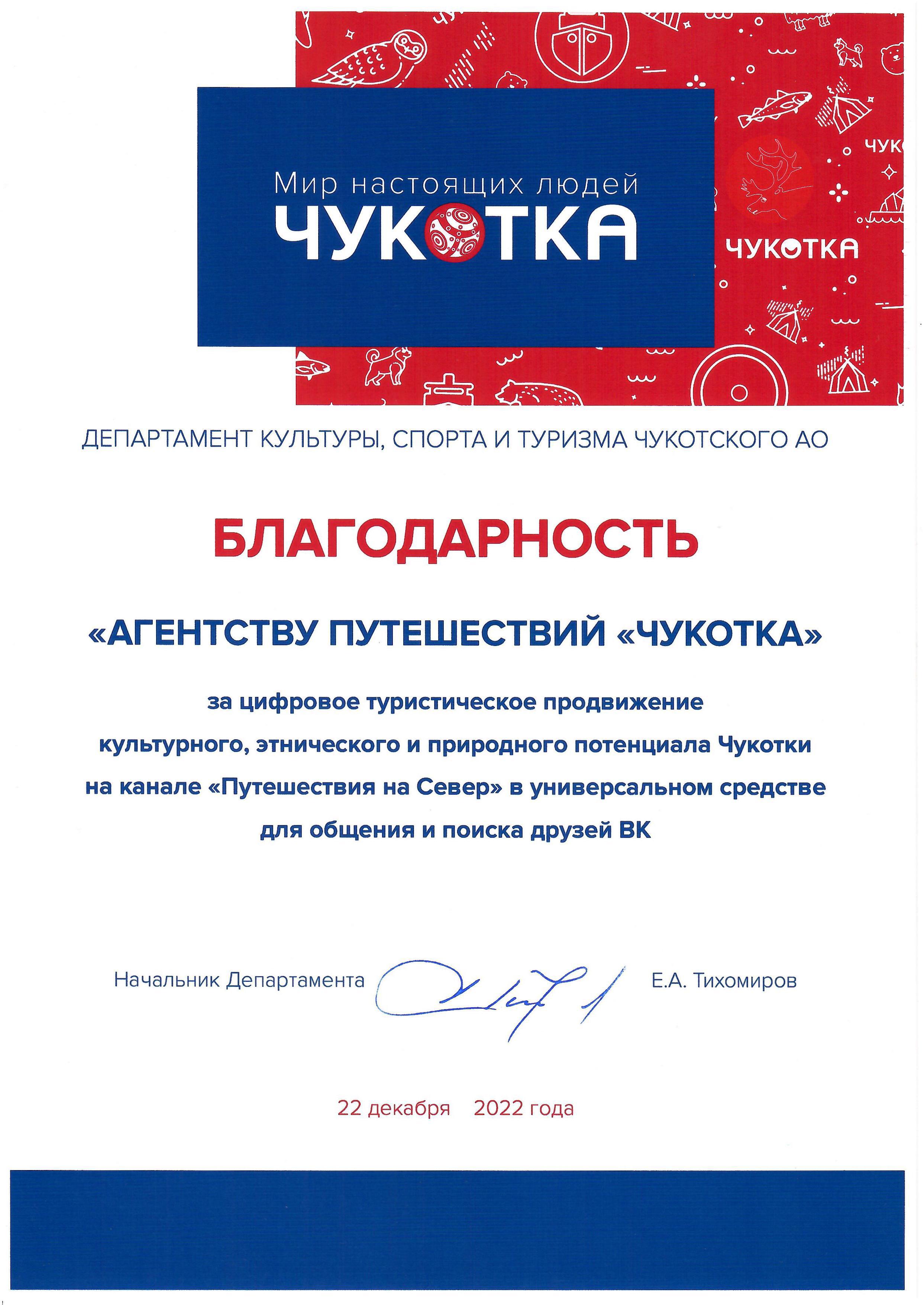 В 2022 году наша работа была отмечена Благодарностью Департамента культуры, спорта и туризма Чукотского автономного округа.